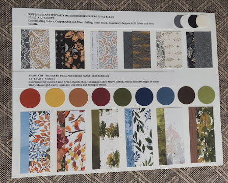 Check out the new Simply elegant Specialty Designer Series Paper and the Beauty of the Earth Designer Series Paper along with the coordinating color spots that go with each one. I should have added Copper, Gold and Silver to the Specialty paper as one side of the paper has Copper, Gold or Silver foiling on it. Once again my camera doesn't pick up that very well in the image. It is beautiful in peson. Both of these papers have a suite that they coordinate with.